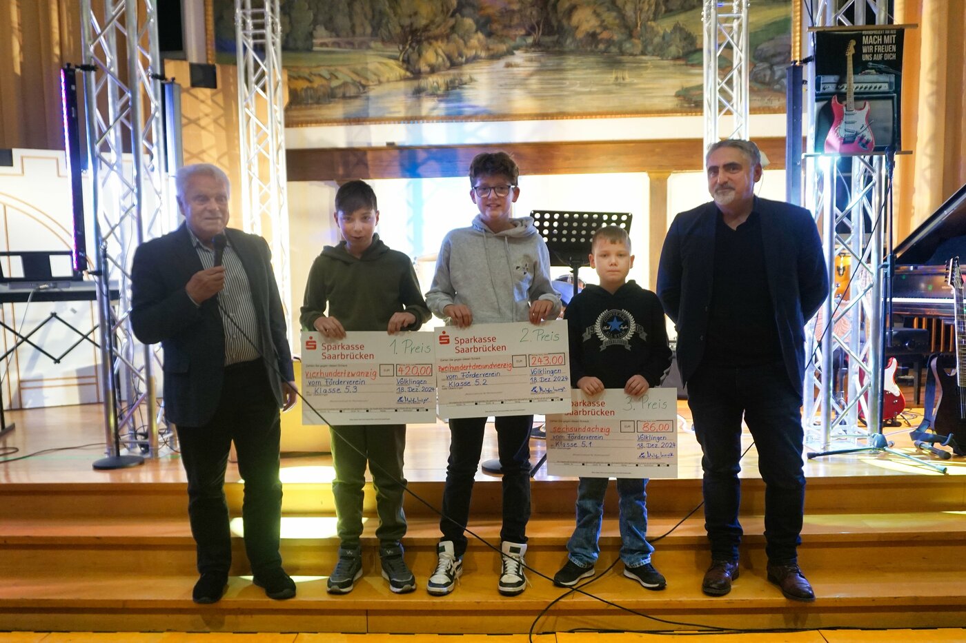 Mustafa Küçük und Rudolf Lavall, die beiden Vorsitzenden des Vereins, überreichten nun beim Weihnachtskonzert die Prämien in Form von symbolischen Schecks an die Vertreter der Klassen. Die höchste Prämie im Schuljahr 2024/2025 über 420 Euro konnte die Klasse 5.3 für sich verbuchen gefolgt von der Klasse 5.2, die sich über 243 Euro freute. Schließlich erhielt die Klasse 5.1 noch 86 Euro für die Klassenkasse.