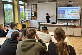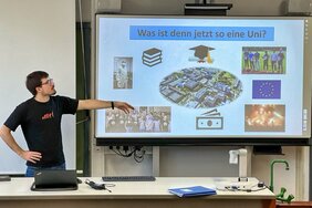 Anfang April besuchte Wendelin Karg, ehemaliger Schüler des Albert-Einstein-Gymnasiums, den Physikunterricht seines ehemaligen Lehrers bei Oliver Lang, um dort den Schülerinnen und Schülern der Klasse 10 über seine Eindrücke aus dem MINT-Studium am Karlsruher Institut für Technologie zu berichten. Wendelin Karg absolvierte 2018 Abitur am Albert-Einstein-Gymnasium, im Physik E-Kurs bei Oliver Lang und im Mathematik E-Kurs bei Steman Victor. Hier war er u. a. in der Redaktion der Schülerzeitung „Albert – Relativ informiert“ sowie bei den Schulsanitätern oder als Moderator bei Veranstaltungen aktiv. Seitdem hat er genauso engagiert weitergemacht. Er ist neben dem Studium in der Studierendenvertretung tätig und hält Tutorien für Studierende im zweiten und dritten Semester.